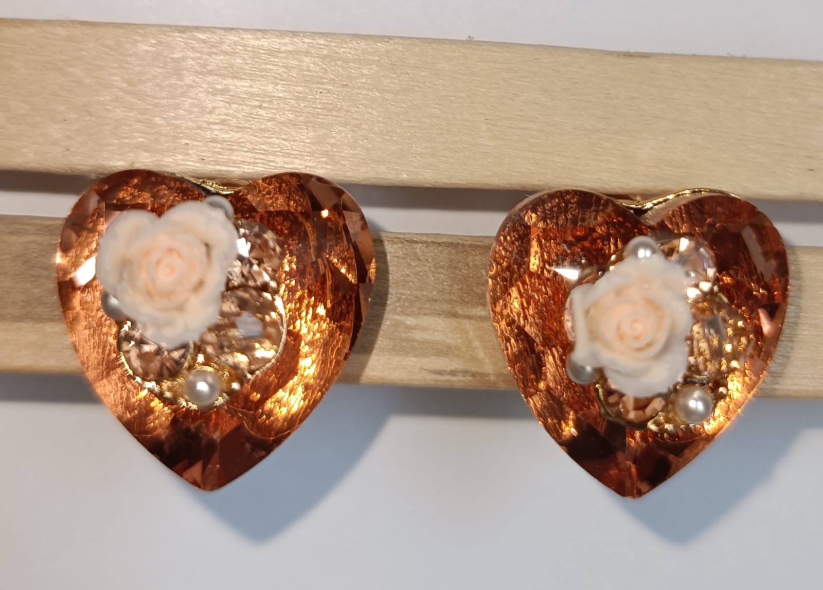 Golden Heart Stud Earrings with White Rose & Pearl AccentsAdd a touch of endless elegance to your look with these chic heart-shaped stud earrings. Crafted with a faceted golden crystal base, these earrings are beautifully embellished with a white resin rose, mini pearls, and sparkling rhinestones.