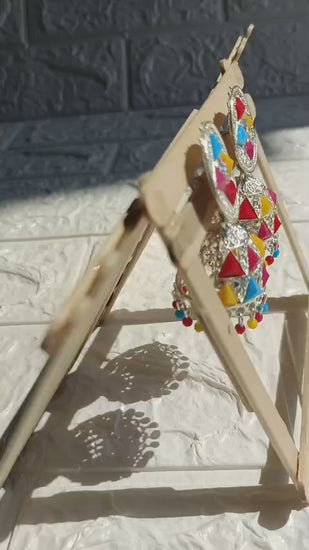 These statement jhumka earrings feature a bold and unique geometric triangle design in vibrant enamel colors – red, yellow, blue, and pink – set on a silver-tone base. The circular stud top is intricately engraved with filigree work and highlighted with a cluster of multicolor stones at the center. The dome-shaped jhumka carries forward the colorful triangular motifs, finished with dangling matching beads at the edges for a playful and festive touch.